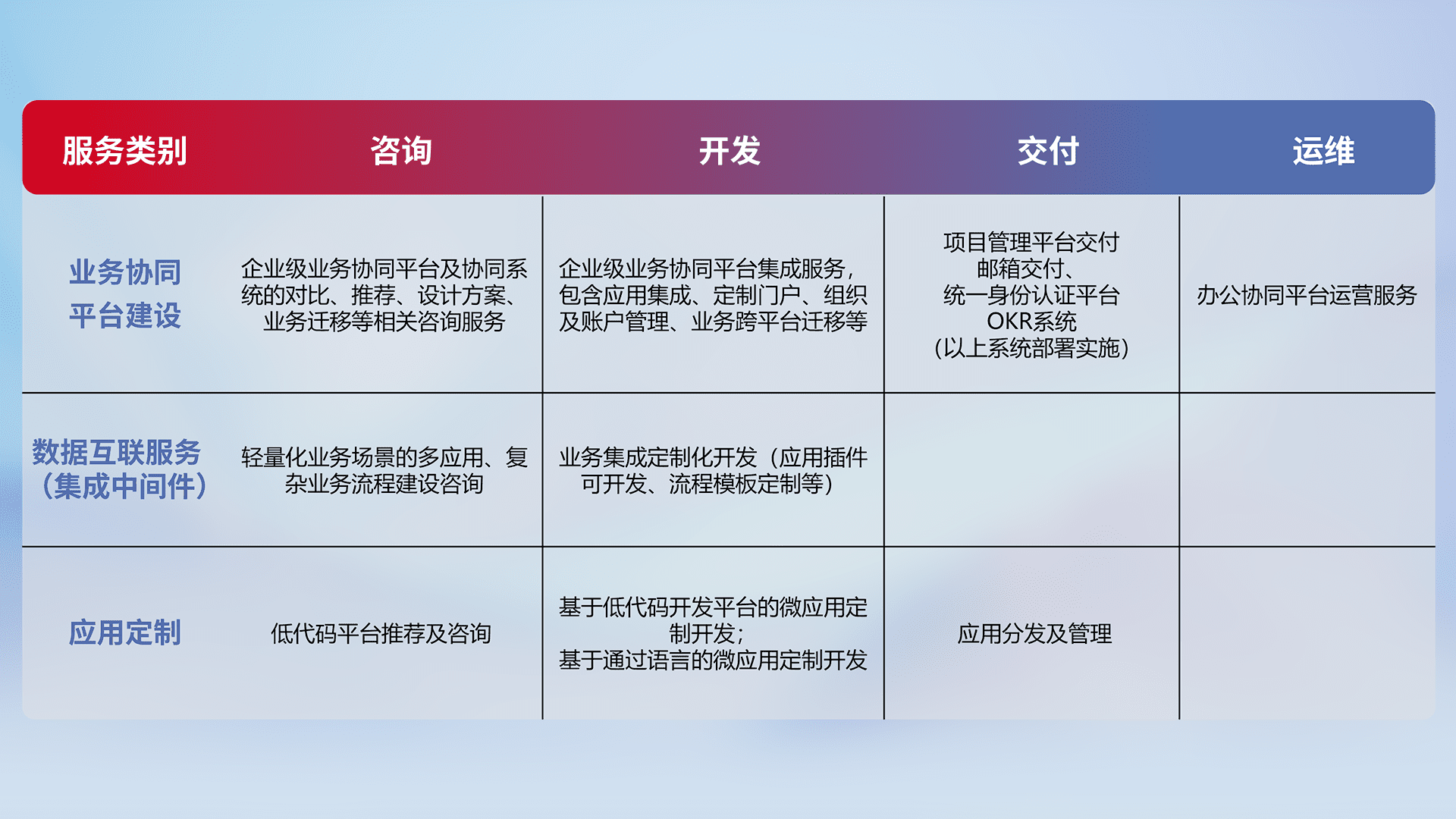 针对钉钉、、企微、、IDaas等平台级产品提供产品的规划、、、方案、、交付、、、定制化开发等服务,,,,实现如统一协同办公、、智能客户服务、、、混合会议管理、、智能数据查询、、等业务场景,,实现数字化转型。。